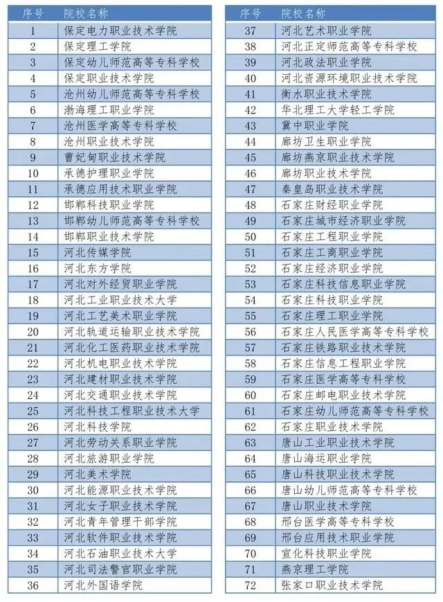 經(jīng)省教育廳批準(zhǔn),2023年河北省實(shí)施高職單招的省內(nèi)院校共有72所,名單如下: