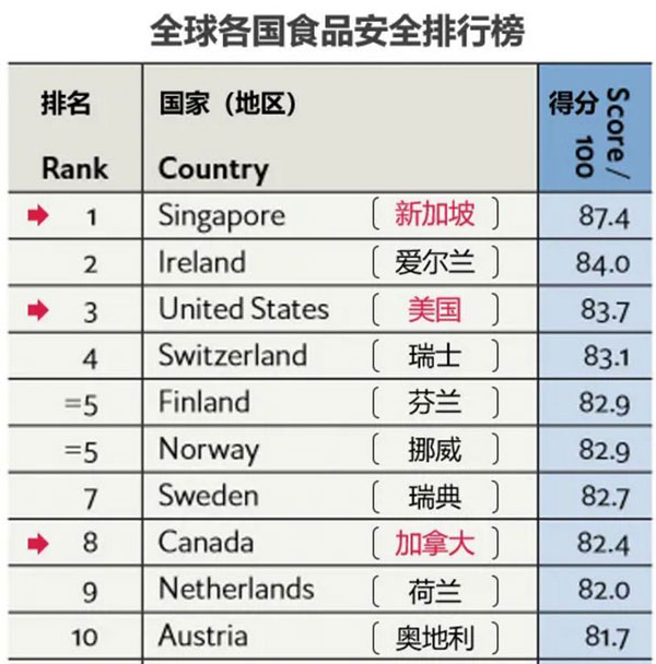 經(jīng)濟學人雜志發(fā)布的《2019全球食品安全指數(shù)報告》給出了2019年世界各國在食品安全方面的排名。新加坡以87.4的高分排在第1位,中國排在第35位;愛爾蘭和美國排在2、3位,加拿大、澳大利亞分列第8、第12位。