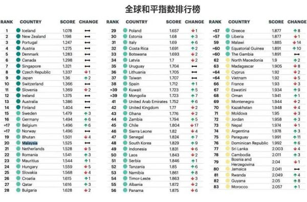 澳大利亞智庫——經(jīng)濟與和平研究所新發(fā)布的《全球和平指數(shù)報告》提供了世界各國最新的和平指數(shù)排行榜。該研究綜合了23個指標,包括境內外沖突、社會安保和軍事信息等方面,將所有指標按照1-5的量化數(shù)據(jù)進行加權平均,最終得到全球163個國家和地區(qū)的和平指數(shù)。