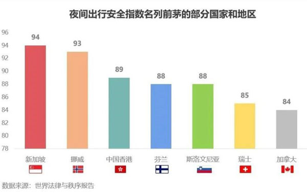 2018年美國民意調查公司發(fā)布的《全球法律與秩序報告》公布了全球142個國家(地區(qū))的夜間出行安全指數(shù)排名。新加坡表現(xiàn)最佳,以94分的高分位居榜首,挪威和中國香港位列第2、3位。