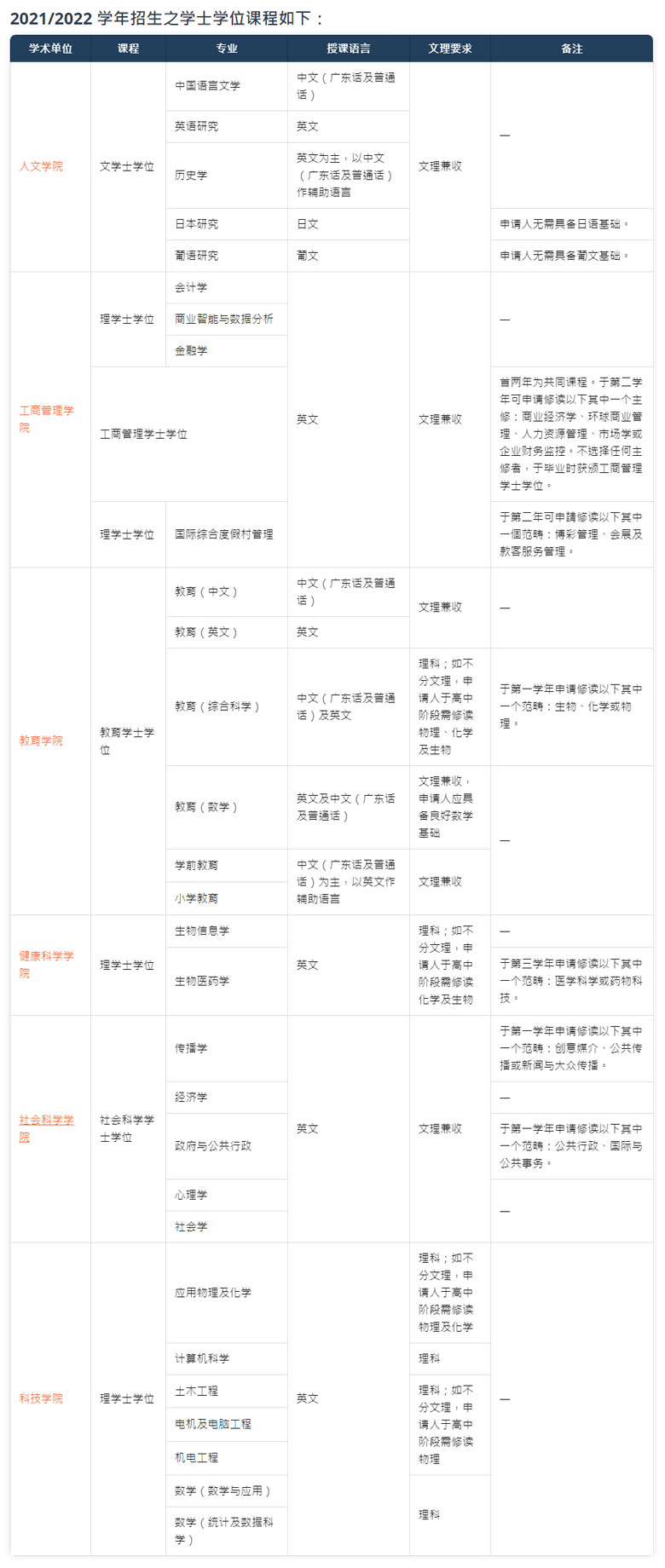 各個(gè)學(xué)院的學(xué)科特色鮮明,提供學(xué)士、碩士、博士等130多個(gè)學(xué)位課程,涵蓋不同領(lǐng)域的專業(yè)學(xué)科。學(xué)士學(xué)位課程采學(xué)分及書院制,以英語為主要授課語言。