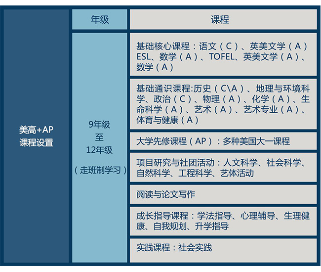 上海師范大學(xué)附屬第二外國語學(xué)校的美國高中課程(美高+AP),課程建立在美國國家核心課程標準(Common Core Standard)和美國大學(xué)理事會(College Board)畢業(yè)要求基礎(chǔ)上,融入四門國家規(guī)定核心課程,另增加美國名校銜接課程與領(lǐng)導(dǎo)力課程,通過外教的全英文授課模式提供完整的美國高中學(xué)習(xí)體驗。