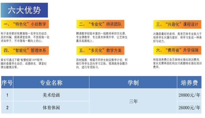 福州市華幟技工學校開設(shè)藝術(shù)體育升學班,專注于體育、美術(shù)升學教育,為有志于大學本科的初中畢業(yè)生開辟一條“捷徑賽道"。美術(shù),體育升學是我國高考升學的一種考試方式,包括文化課考試和專業(yè)課考試,只要文化課考試和專業(yè)課考試均通過藝體類錄取本科線,就能被大學高校錄取。以專業(yè)課為升學優(yōu)勢,通過三年學習,突出重圍,鳳凰涅槃,以達“圓大學本科夢”為辦學目標。