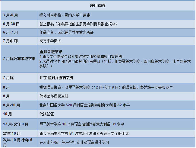 每年7月中旬安排羅馬美術學院考試委員會來北京進行招生面試,面試名額全國150人。通過面試的學生可在8月底前獲得有條件錄取通知書,在獲得意大利留學簽證并通過羅馬美術學院組織的B1水平語言考試后,可直接進入專業(yè)學習,無需再參加專業(yè)入學考試;未通過面試的學生可繼續(xù)參加其他意大利美院的評審或申請其它留學項目。