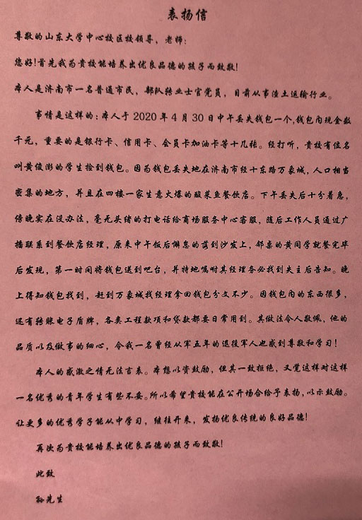 拾金不昧是中華民族的傳統(tǒng)美德,也是個(gè)人良好道德風(fēng)尚和崇高社會(huì)責(zé)任感的具體表現(xiàn)。繼2019年9月接待了突然到訪并致謝張心怡、魏妍卿的失主后,2020年5月6日,美英澳國(guó)際教育項(xiàng)目辦公室又收到了一封來(lái)自孫先生的表?yè)P(yáng)信,一頭霧水的班主任老師經(jīng)電話核實(shí)得知事情經(jīng)過(guò):2020年4月30日中午,山東大學(xué)美英澳國(guó)際教育項(xiàng)目的黃俊澎同學(xué)去萬(wàn)象城酸菜魚(yú)就餐,準(zhǔn)備離開(kāi)之際,撿到了裝有現(xiàn)金數(shù)千元、銀行優(yōu)盾、加油卡、會(huì)員卡等貴重物品的錢包。沒(méi)有聯(lián)系方式、物品貴重,黃俊澎同學(xué)選擇了坐等失主,因?yàn)橄挛邕€有網(wǎng)課,在等待兩個(gè)多小時(shí)無(wú)果后,只能把錢包交給商城服務(wù)臺(tái),黃俊澎同學(xué)核對(duì)、交接并叮囑工作人員:因包里貴重物品較多,失主領(lǐng)取時(shí)請(qǐng)—定當(dāng)面核對(duì),并第一時(shí)間給他打電話,有問(wèn)題他也會(huì)第一時(shí)間折回??∨炝粝侣?lián)系方式離開(kāi)。。。失主孫先生被這種拾金不昧、勇于擔(dān)當(dāng)?shù)男袨楦袆?dòng),在重金酬謝被拒后,才把這封表?yè)P(yáng)信郵遞到了學(xué)校。這種拾金不昧的行為雖然看似普通,但卻能彰顯出學(xué)院良好的風(fēng)氣和學(xué)生的高尚品德,近年來(lái)經(jīng)濟(jì)學(xué)院在全面培養(yǎng)學(xué)生綜合素質(zhì)的同時(shí),將德育教育貫徹在教育教學(xué)活動(dòng)中,得到師生的—致好評(píng)和認(rèn)可。