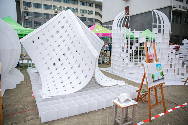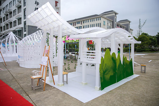 比賽充分激發(fā)和調(diào)動(dòng)了學(xué)生們進(jìn)行建筑設(shè)計(jì)的熱情和創(chuàng)造力。在比賽現(xiàn)場(chǎng),學(xué)生團(tuán)隊(duì)拓展思維、同心協(xié)力,連續(xù)創(chuàng)作8小時(shí)。建造完成后,一座座名為“山語”、“川戀”、“曲水流觴”、“水秀山黛”等形態(tài)生動(dòng)又充滿藝術(shù)氣息的中空板建筑屋呈現(xiàn)在大家眼前,其創(chuàng)意與造型令在場(chǎng)觀眾贊嘆不已。在評(píng)委評(píng)分環(huán)節(jié),各校參賽選手和老師們也相互觀賞作品,共同交流和探討建造技術(shù)經(jīng)驗(yàn)。