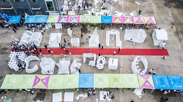 本次比賽以“山水間·微社區(qū)”為建造主題,鼓勵(lì)學(xué)生們充分融合桂林山水文化和綠色、節(jié)能的環(huán)保理念展開創(chuàng)作,利用塑料中空板現(xiàn)場(chǎng)搭建室內(nèi)活動(dòng)空間15立方米以上的創(chuàng)意微社區(qū),并滿足集中活動(dòng)的站、坐、躺、臥尺度要求。