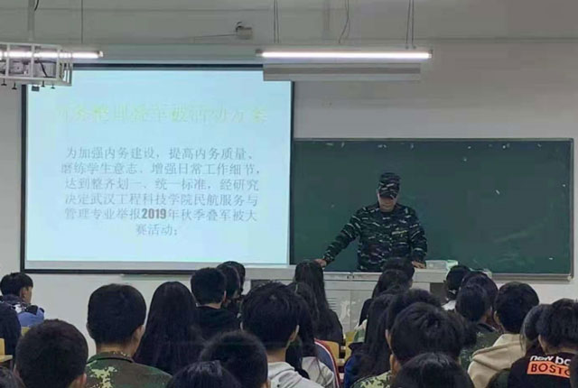 為加強(qiáng)內(nèi)務(wù)建設(shè),提高內(nèi)務(wù)質(zhì)量、磨練學(xué)生意志、增強(qiáng)日常工作細(xì)節(jié),達(dá)到整齊劃一、統(tǒng)一標(biāo)準(zhǔn),經(jīng)研究決定武漢工程科技學(xué)院民航服務(wù)與管理專(zhuān)業(yè)舉報(bào)2019年秋季疊軍被大賽活動(dòng)
