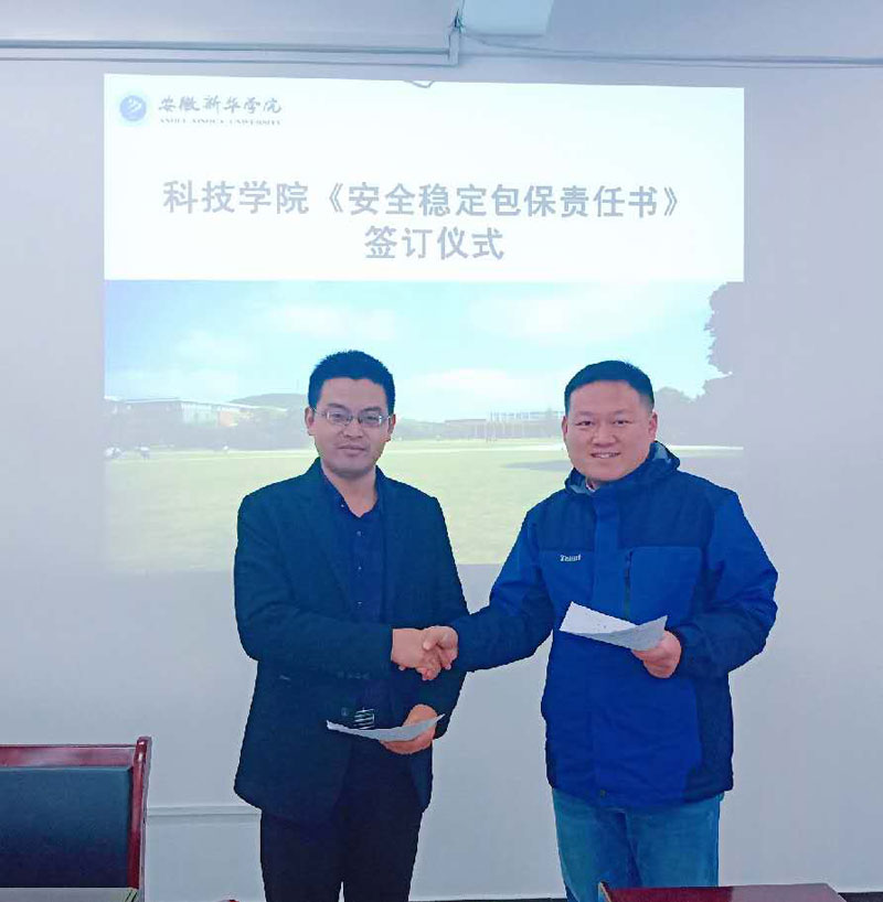 為了全面落實學(xué)校安全穩(wěn)定工作要求,確保學(xué)生良好的學(xué)習(xí)、生活秩序,不斷強化安全工作責(zé)任,強化“紅線”意識和底線思維,3月18日上午,科技學(xué)院在204會議室舉行了《安全穩(wěn)定包保責(zé)任書》簽訂儀式??萍紝W(xué)院黨總支書記、執(zhí)行院長孫成偉出席會議并作指導(dǎo)講話,全體輔導(dǎo)員參會,簽約儀式由李冬老師主持。