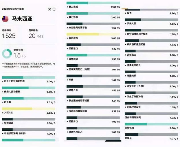 馬來西亞2020全球和平指數(shù)位居亞洲第三