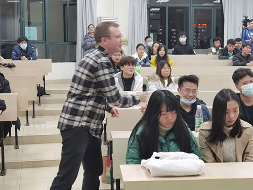Ben Keegan老師還詳細(xì)地介紹西方餐桌禮儀。Ben Keegan老師為現(xiàn)場的同學(xué)們生動、風(fēng)趣地描述了他的親身經(jīng)歷,使同學(xué)們進(jìn)一步了解了在西方國家如何正確地就餐。