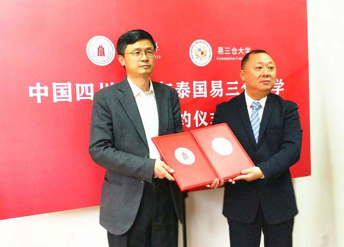 4月2日,四川大學(xué)與泰國(guó)易三倉(cāng)大學(xué)舉行1+2+1本碩連讀項(xiàng)目簽約儀式。四川大學(xué)出國(guó)留學(xué)人員培訓(xùn)部/出國(guó)留學(xué)預(yù)備學(xué)院書(shū)記劉俐、院長(zhǎng)陳兵、副院長(zhǎng)鄢瀾、招生辦公室主任蒲詩(shī)璐,以及易三倉(cāng)大學(xué)/泰中國(guó)際學(xué)院院長(zhǎng)高力、副院長(zhǎng)徐峰等相關(guān)領(lǐng)導(dǎo)出席了簽約儀式。