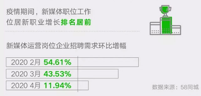 2020年以來,面對新冠肺炎疫情的沖擊,線上業(yè)務(wù)的爆發(fā)性增長,數(shù)字化就業(yè)逆勢上揚(yáng)。流量運(yùn)營、社群運(yùn)營、短視頻運(yùn)營、公眾號運(yùn)營等崗位需求大幅增加。新媒體運(yùn)營在新職位增長排名靠前。