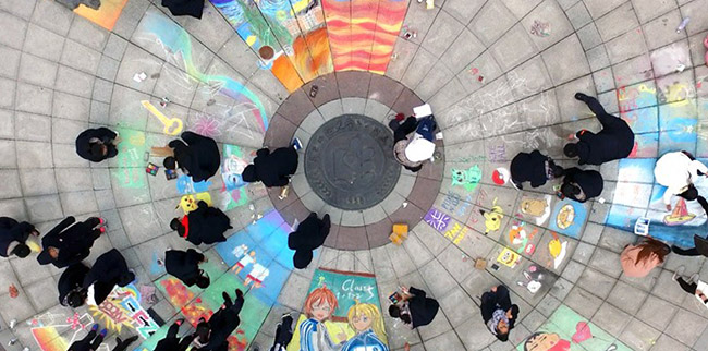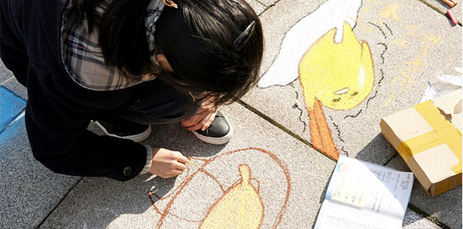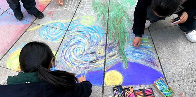 即便天色逐漸暗沉,大風(fēng)愈加凜冽,同學(xué)們卻仍然頂著寒風(fēng),興致勃勃地為腳下的一寸土地增光添彩。詢問(wèn)一名同學(xué)最大的感受,她說(shuō),天氣很冷,但當(dāng)與并肩的伙伴們一起站在完成的畫作旁欣賞時(shí),心中的自豪感與成就感使周圍的空氣都變得溫暖起來(lái)。
