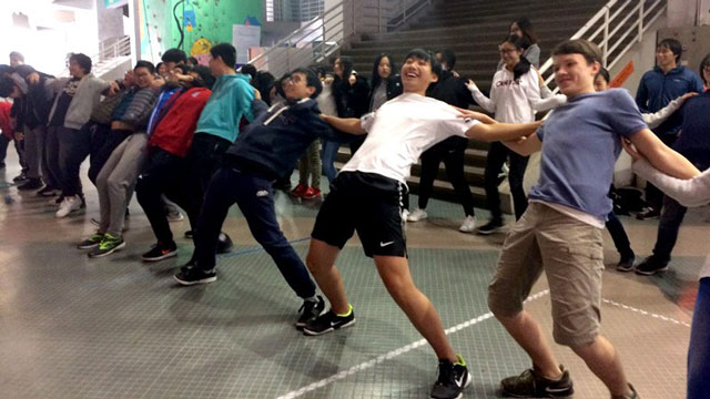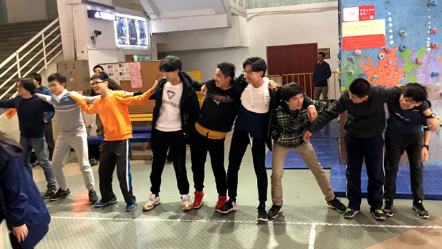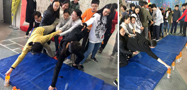 為確保同學(xué)們的自身安全,在開始活動(dòng)前,教練帶領(lǐng)大家進(jìn)行了熱身,互相搭著肩,在熱身的同時(shí)也不覺增強(qiáng)了團(tuán)結(jié)性。趣味游戲舒展經(jīng)絡(luò),對他人的信任和活動(dòng)身軀融入于一個(gè)簡單的“過河取水”游戲。種種活動(dòng)逐漸點(diǎn)燃學(xué)生躍躍欲試的攀登激情,讓冬日的冰寒不再充斥于場內(nèi)。