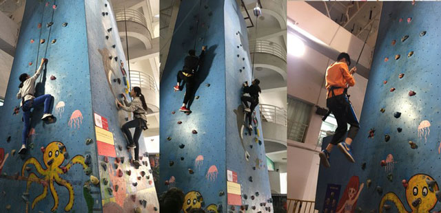 在一片歡騰的喧鬧中,攀巖終于開始了。同學(xué)們在巖壁上各顯風(fēng)姿,觸目驚心間被挑戰(zhàn)著生理和心理極限。抬眼間是數(shù)尺人工峭壁,低頭則對上“深淵”。在加油鼓勁的吶喊聲中,峭壁上的學(xué)生雖有些手腳發(fā)抖卻不愿放棄,逐漸變得酸軟的身軀終是不堪重負(fù),最后一個(gè)美妙的身姿就是松開雙手,讓自己在保護(hù)裝備下自由落體。此時(shí),各路清奇姿勢五花八門,用盡全力嘶吼著各顯神功。更有甚者,帶著“恐高癥”挑戰(zhàn)自我,百米高空中頂著壓力低頭一望,僅此一望卻是尖叫著松了手。